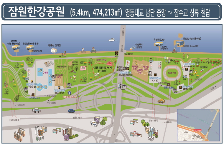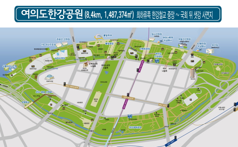여의도한강공원은 정치, 금융, 언론의 중심지인 여의도에 자리하고 지하철, 버스 등 대중교통으로 접근성이 좋아 직장인과 일반시민들이 즐겨찾는 명소이자 봄꽃축제, 세계불꽃축제, 각종 공연 및 마라톤행사 등 다양한 행사가 이어져 볼거리와 즐길거리가 풍부한 휴식공간입니다. 또한 밤섬, 여의도 샛강 등이 비교적 자연그대로 보존되어 있어 생태학습장 및 자연친화형 공원으로 조성되어 있습니다.